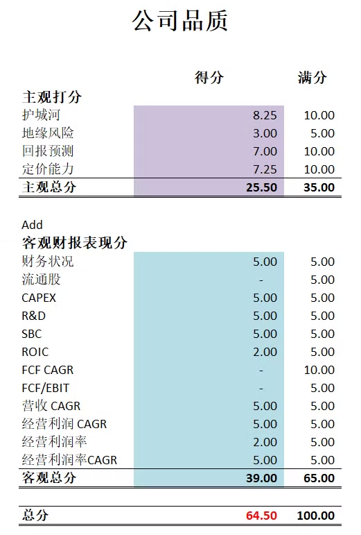 -最新公司可以打到59.50分。分数不高,护城河我给了13.50分。定价能力和回报可预测性,我给的不高,因为EV市场即便是BYD这样的市场龙头,仍然也面临着巨大的竞争。 流通股得不到分,CAPEX超级大,所以也得不到分。R&D开支巨大,只能得1分。ROIC表现一般。FCF目前由于巨大的CAPEX,也是开始断崖式跳水。