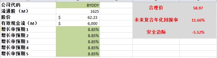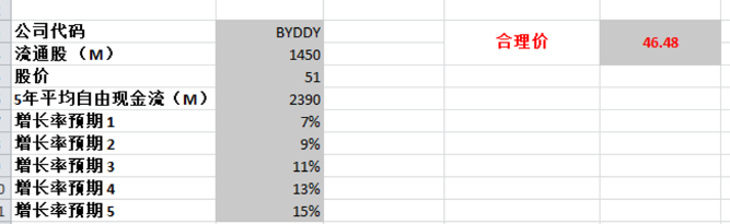 使用的是5年平均的FCF2.39B,最高一档使用的是15%,合理价是46.48