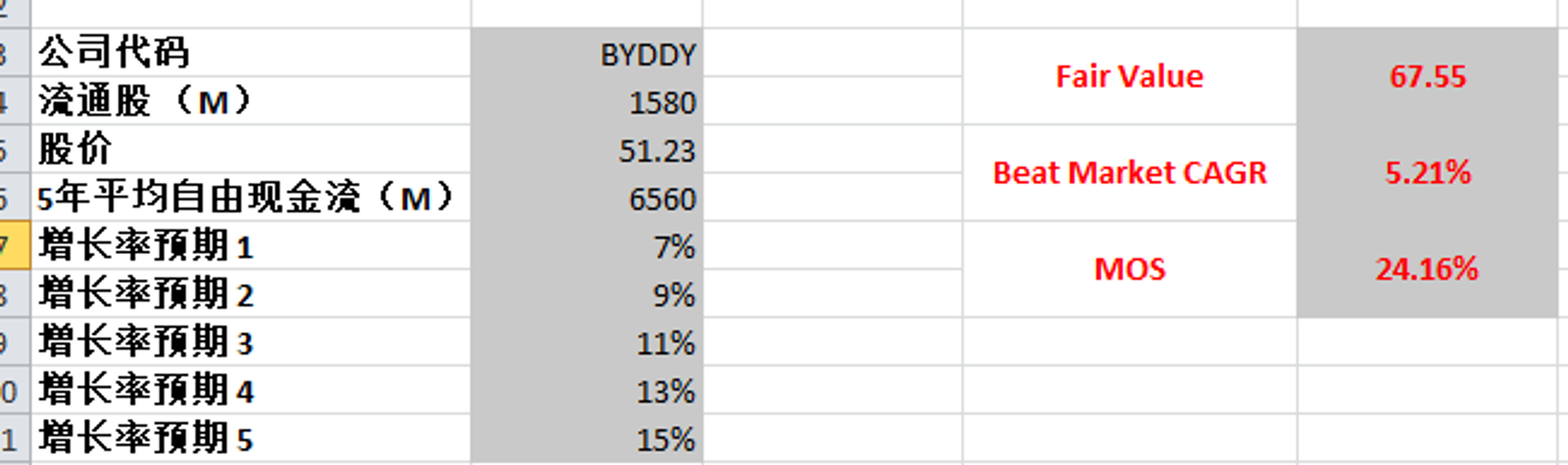 用最新FCF 6.56B,5年CAGR有30%,增长率很好,所以我决定用最新的FCF来算,最高一档只用15%,合理价是67.55