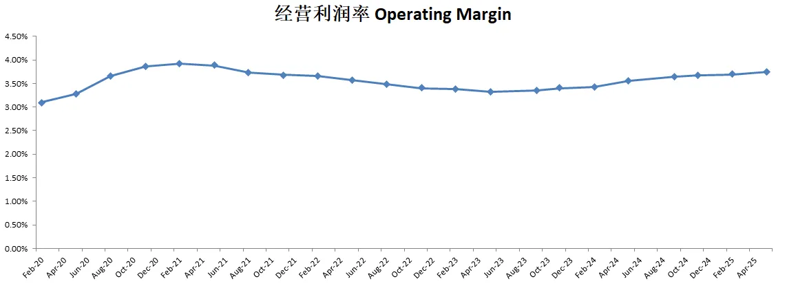 经营利润率为3.8%,比起12个月数据有所进步,Costco经营效率仍然在提升