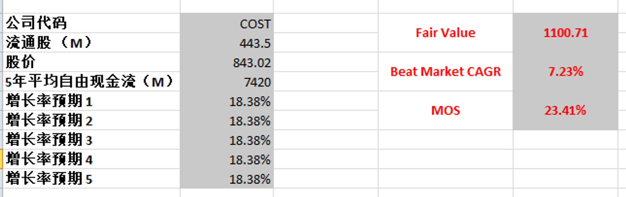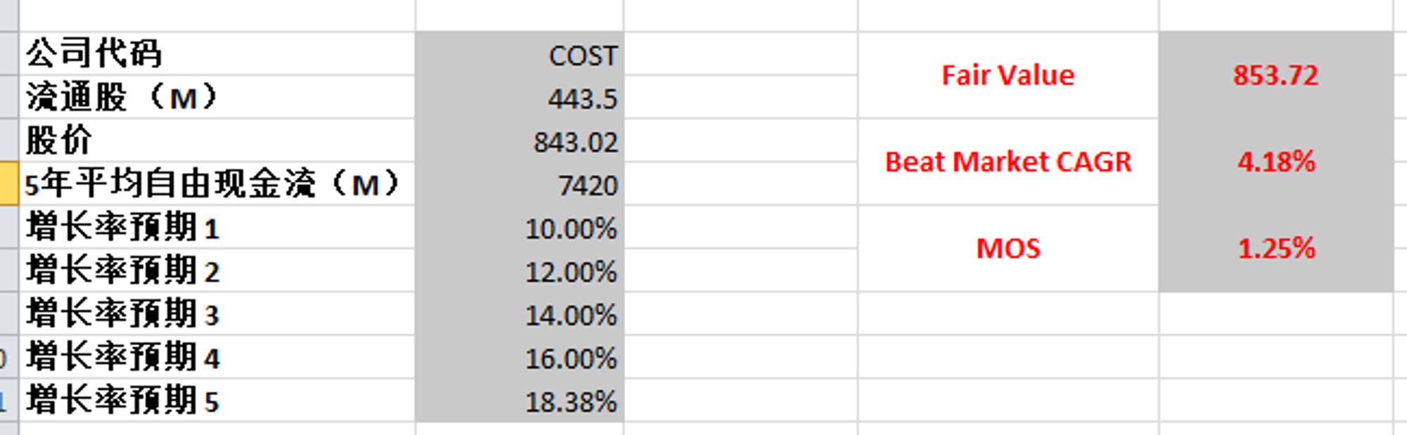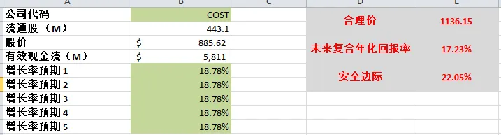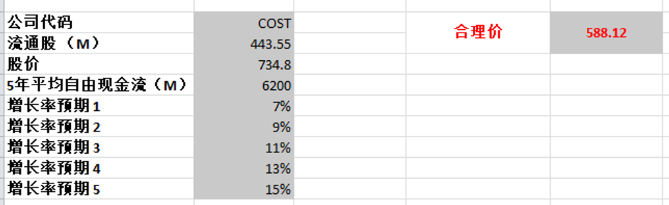 合理价为853.72,似乎目前市场对Costco的定价就是我这个预期