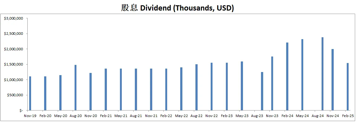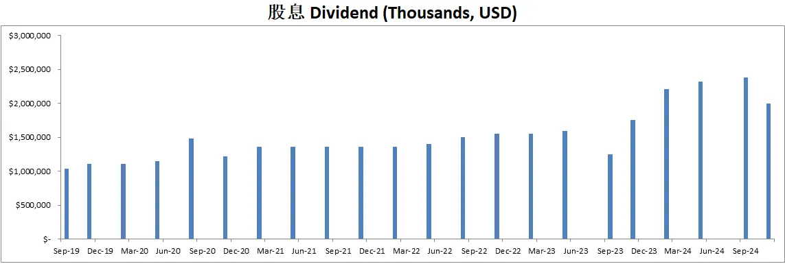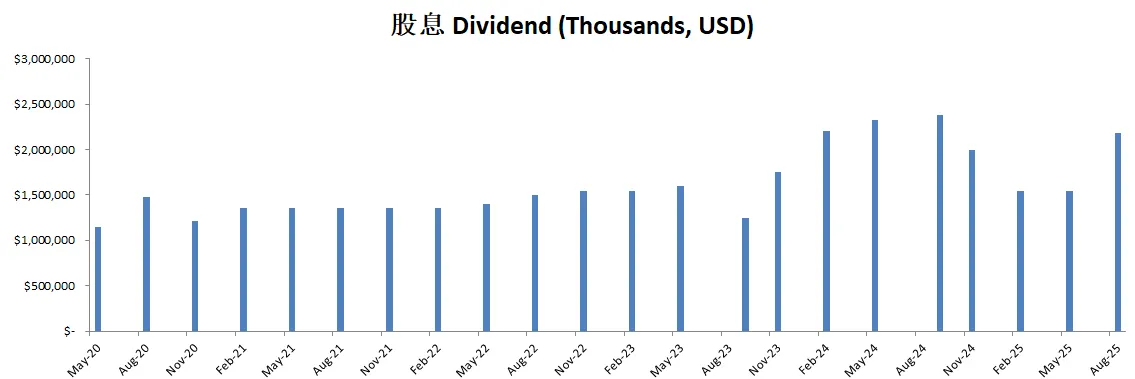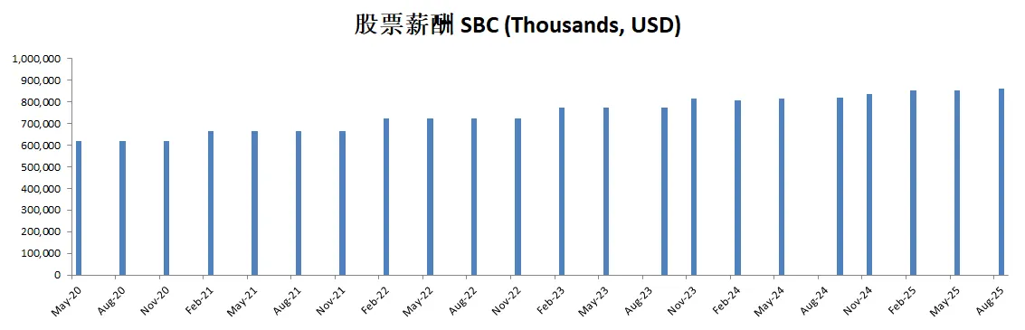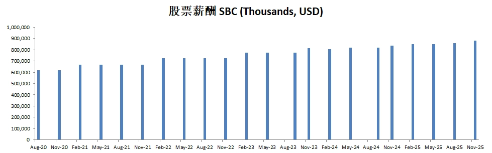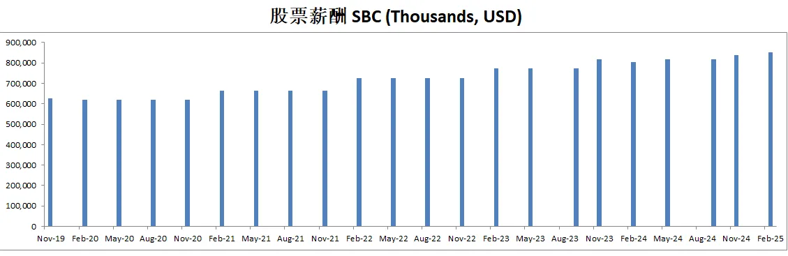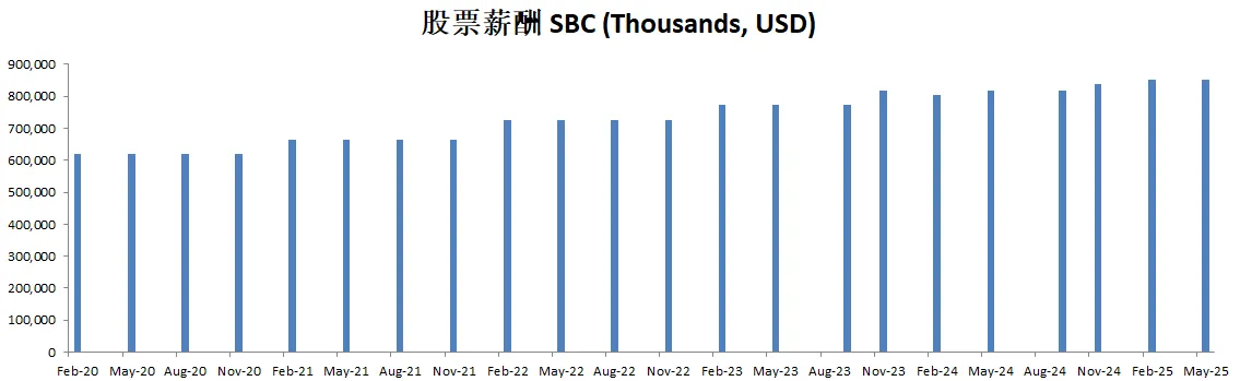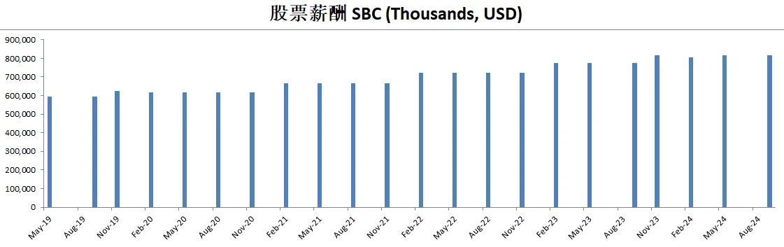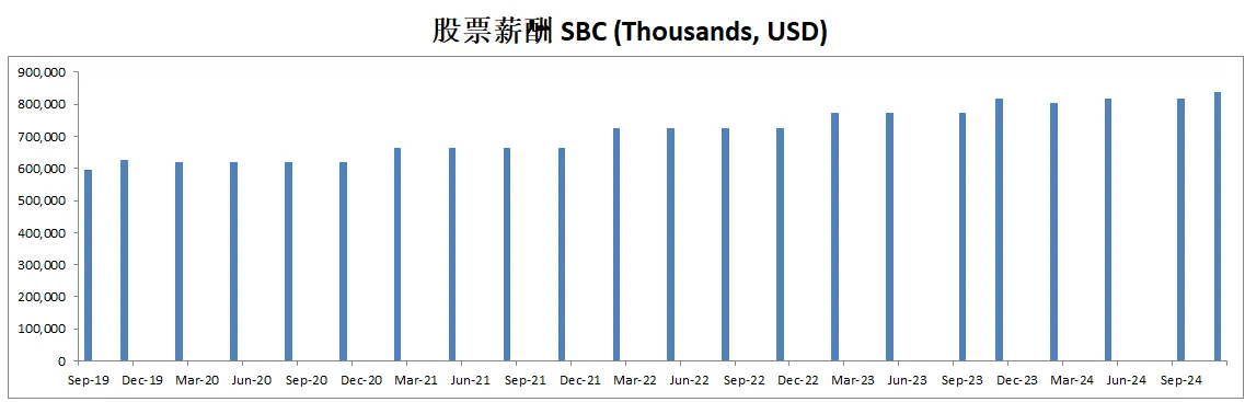 公司派息的同时,12个月买回去了价值714M的股份,值得一提的是,由于巨大的SBC,公司流通股反而有少量的增加,稀释了股东权益