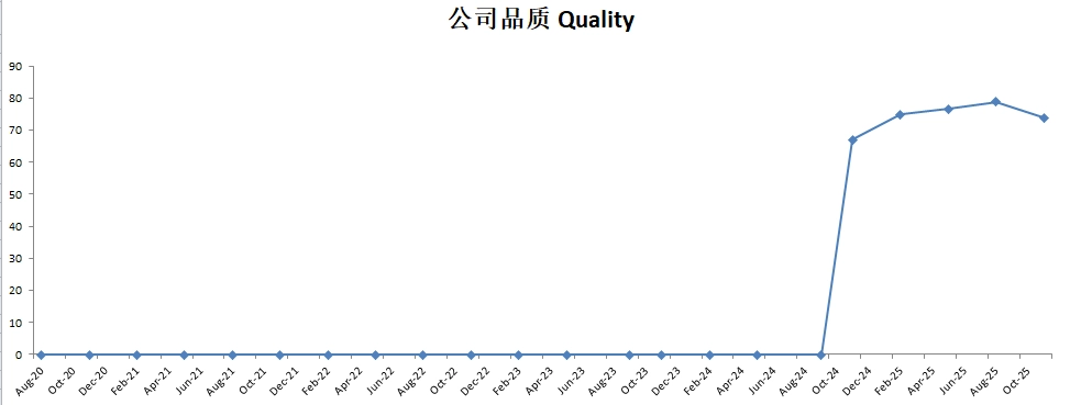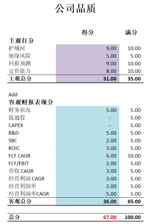 -公司品质为67分。分数在我的打分体系中,可能是被低估的,不过公司的确在很多项上得分很低。这个季度财报在公司品质分上掉分很多,一下掉了4.5分。