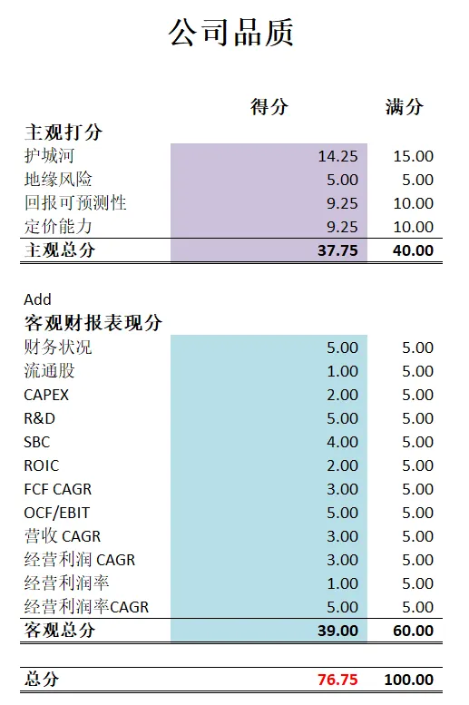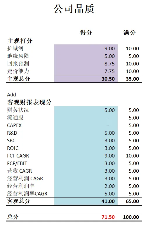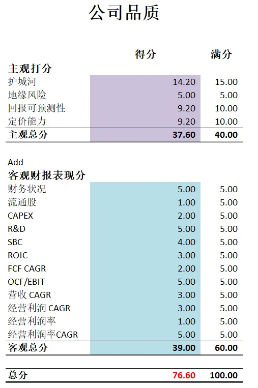 -最新财报之后,公司品质在我的打分体系下可以打到76.60分。主观分我给得很高,原因也很简单,在Costco所处的仓储型市场中,它是无敌的,即便是亚马逊和沃尔玛也是没法挑战它。客观分打分也很高。虽然公司经营利润率得分很低,但是公司利润率低是因为这是Costco的战略。它赚的主要是会员费。从某种意义上来讲,Costco也是一家订阅式的SAAS模式公司。