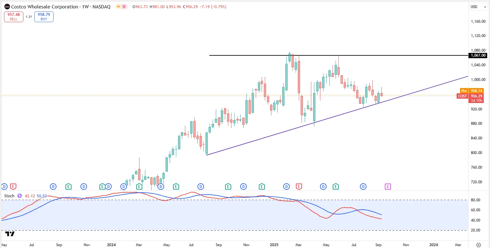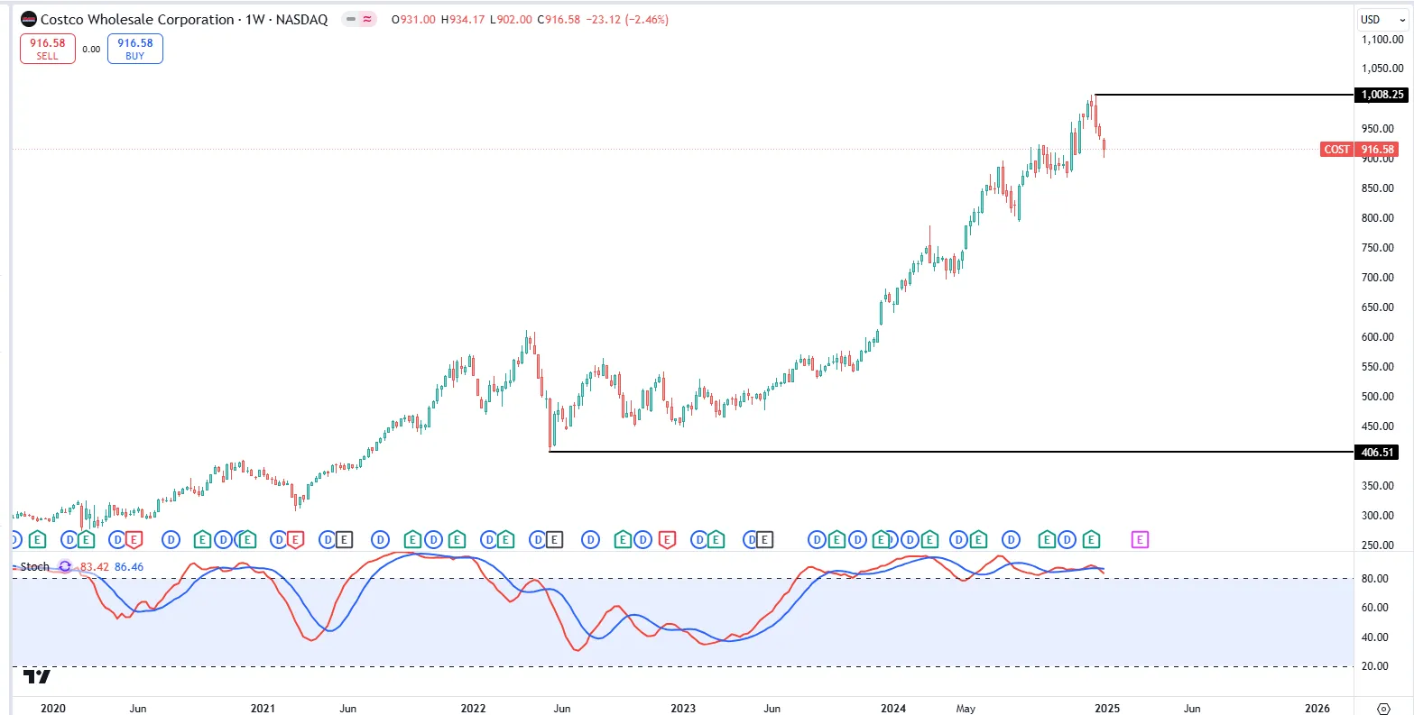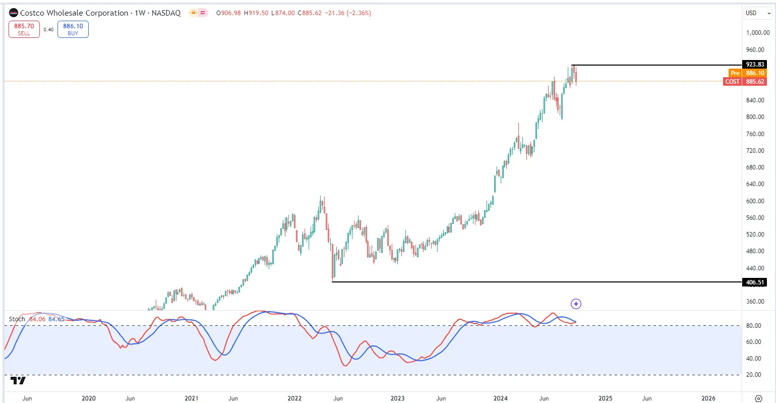 -Costco股价上升势头很强势,可以看到一系列的higher lows
