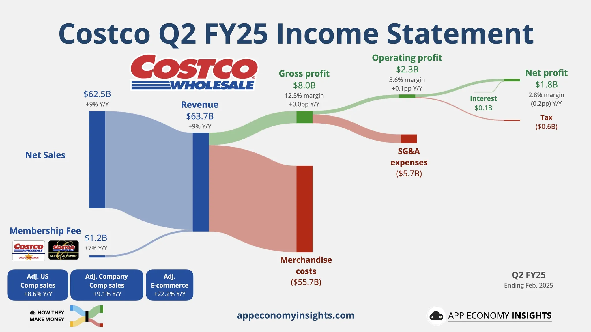 整体财务表现 Costco 在 2025 财年第二季度(截至 2 月 16 日)的净销售额达到 625.3 亿美元,同比增长 9.1%。同店销售(comps)整体增长 6.8%,若排除油价和汇率影响则达 9.1%,其中美国同店销售增长 8.3%、加拿大增长 4.6%、其他国际增长 1.7%、电商增长 20.9%。第二季度净收益为 17.88 亿美元,每股摊薄收益 4.02 美元,若剔除上一年一项特殊税收减免,净收益同比增幅约为 8.4%。2 月份销售额为 198.1 亿美元,同比增长 8.8%,当月同店销售增幅为 6.5%,排除油价和汇率影响则为 8.3%。