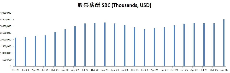 SBC近12个月开了2.84B,5年来CAGR有15.87%,占FCF25%,在科技行业来看,还能接受,但是如果作为股东来考量,我认为还是SBC还是开太多了