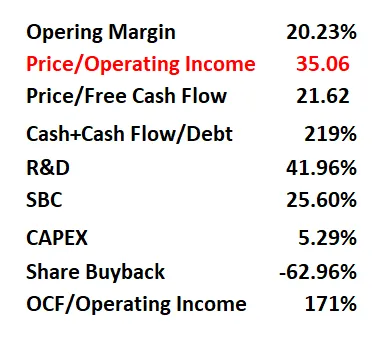 -客观分上来看,流通股上得不到分,因为公司有一定程度上的增发。另外,公司R&D特别高,SBC特别高,ROIC表现很一般。这些都只能得到1分。但是,公司的盈利能力很强。各项盈利分都很高。