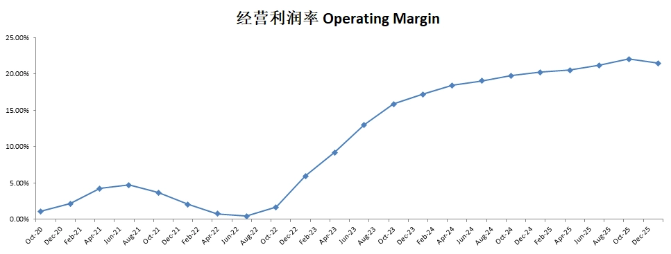 最新季度经营利润率有19%,高于近12个月(18.44%)
