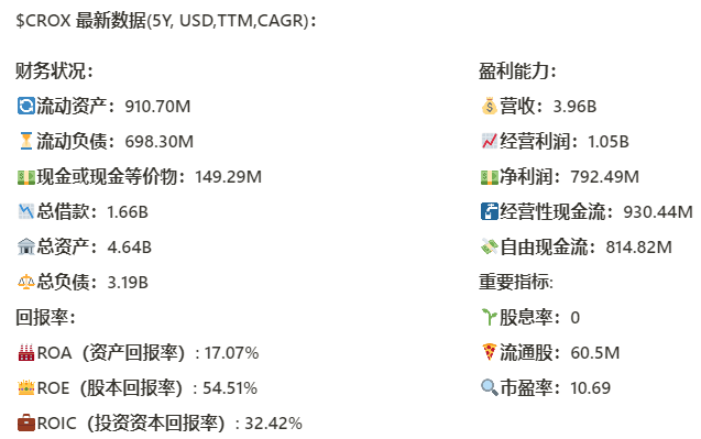 从 $CROX 基本面来看,资产负债表还行,但是借款还是太高,不过公司从22年开始正在陆续偿还