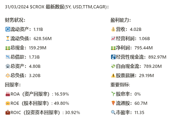 今天我们来分析下CROX截至24年3月的表现如何