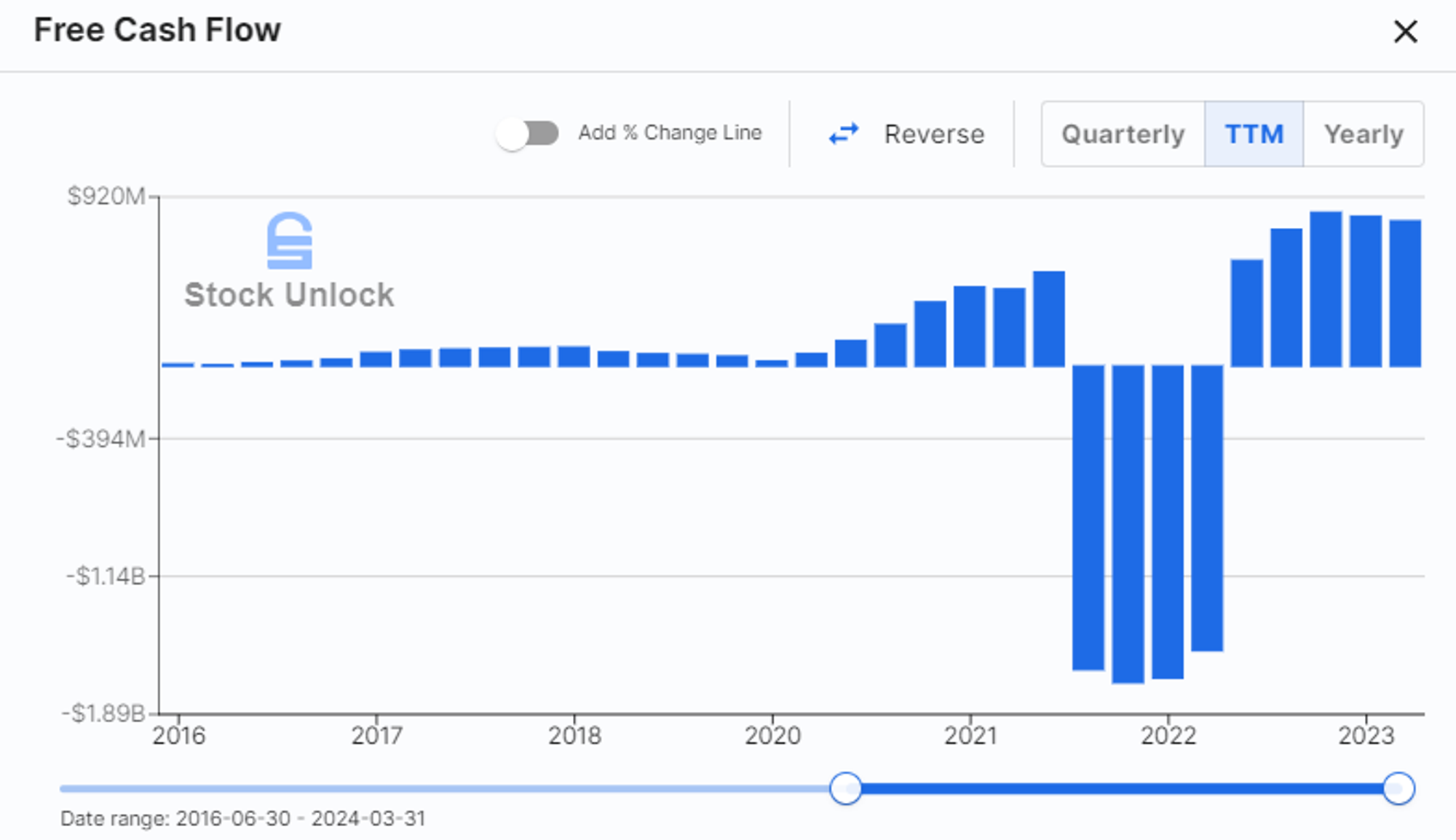 23年4个季度FCF表现不错,如果按照最新814.82M FCF来算,现在的确是算便宜的,不过才1年的数据,值得一直关注