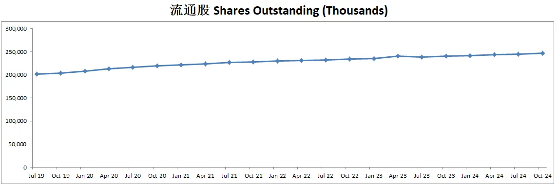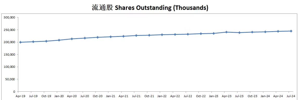 公司长期增发,目前5年来稀释流通股几乎翻了2倍,CAGR为14.76%
