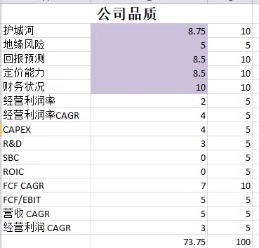 -公司品质有73.75分,公司增长特别快,经营利润和FCF都保持了良好的增长。
