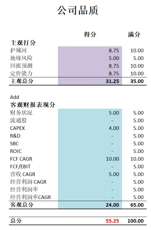 -不过公司品质分在我的打分系统中,只有55.25分。公司短板很多,客观分上很多项目都是0分。但是,自由现金流增长很快。