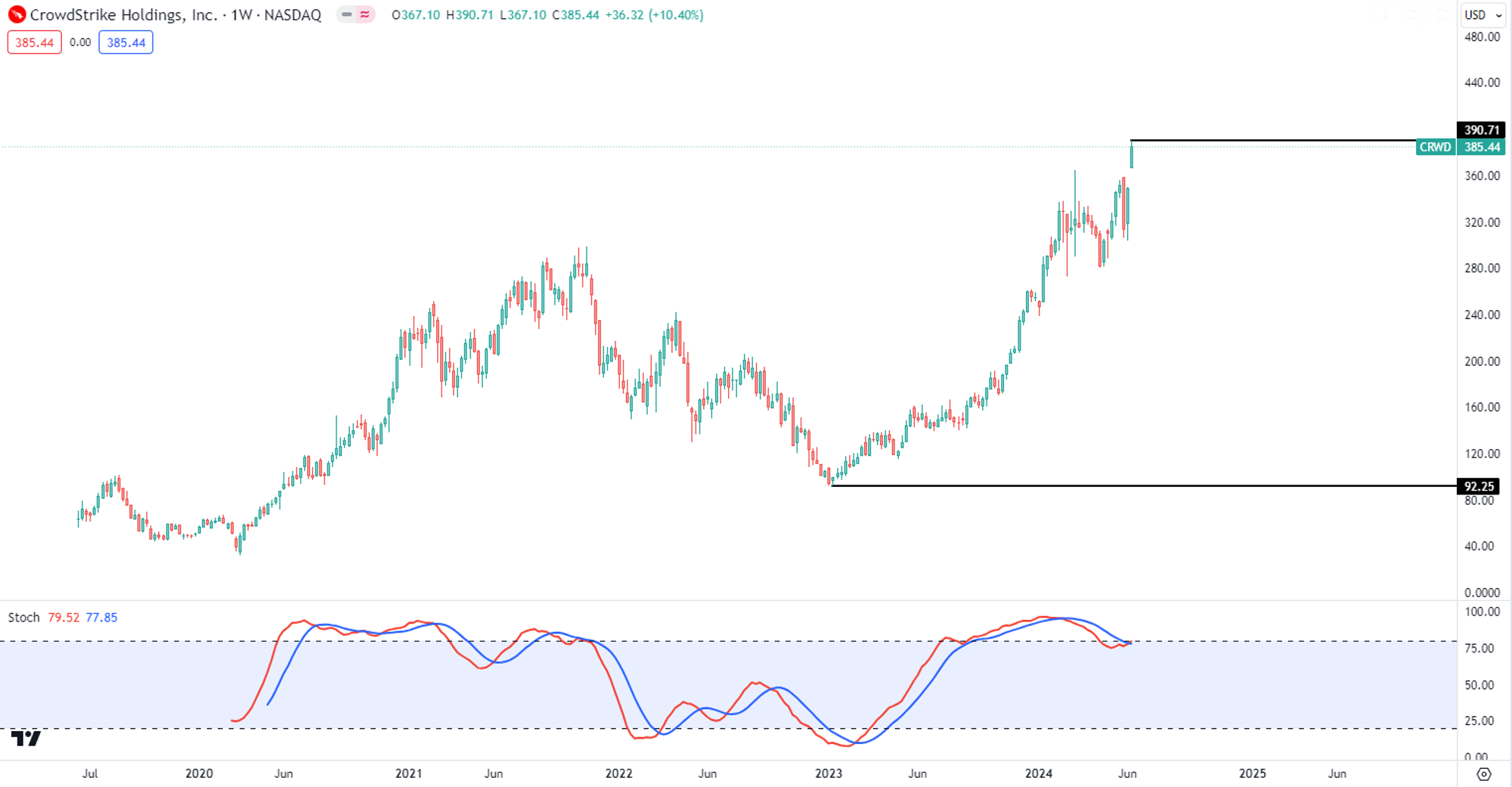 Crowdstrike ( $CRWD )518天,涨了323.53%,翻了4.23倍,截至24年4月表现: