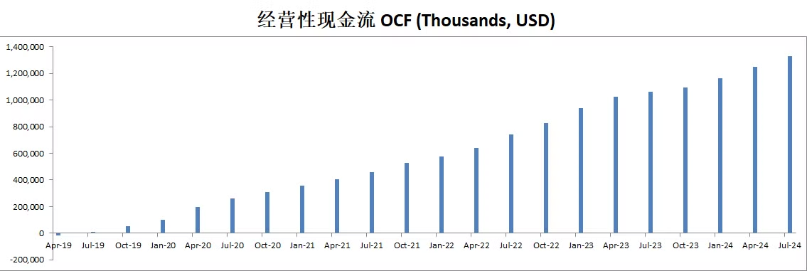 最新FCF为1.02B,5年来CAGR差不多得有300%,显然公司已经来到1.02B的体量,不可能继续保持这么夸张的增长,公司财报中给FCF的预期是31%-33%