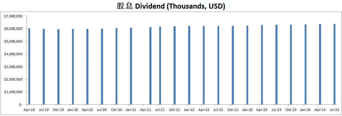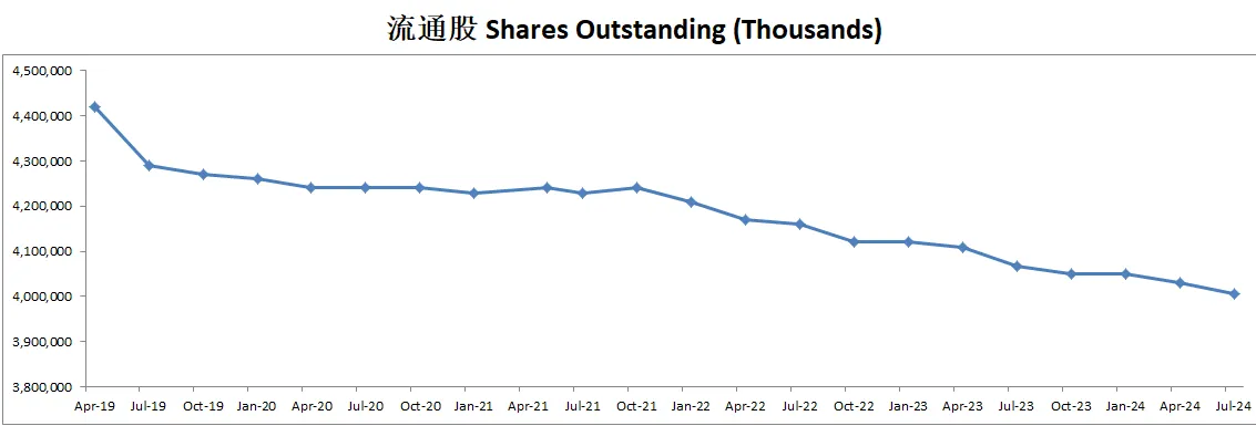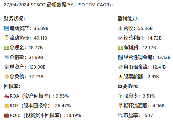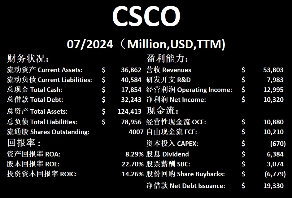 公司财务健康,这个季度发行了大量借款。ROIC最新仍然有18.19%,不过这几年一直在缩水。营收和经营利润增长缓慢。FCF目前为负增长。SBC派发越来越多,这里我不太明白,公司增长缓慢,没有见到成效,但是为什么管理层一直派发奖励。公司派息的同时持续回购股份。公司这个季度完成了对Splunk的收购,交易金额为27.4B,这也是思科有史以来最大的收购。