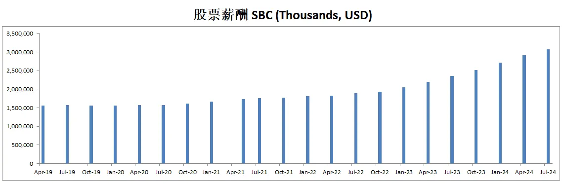 SBC 12个月有2.91B,刷新新高,5年CAGR有13.85%,这里我不太明白,公司增长缓慢,没有见到成效,但是为什么管理层一直派发奖励