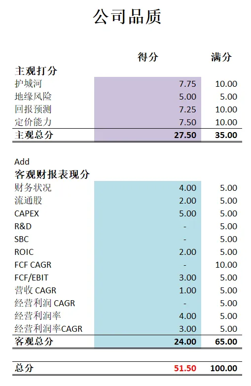 -公司评分不高,只有51.5分。主要扣分项目也有很多,比如R&D特别高,SBC特别高,ROIC表现一般,自由现金流增长率越来越低。