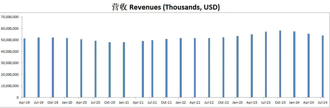 最新营收为55.36B,5年CAGR为 1.37%,基本上没有增长