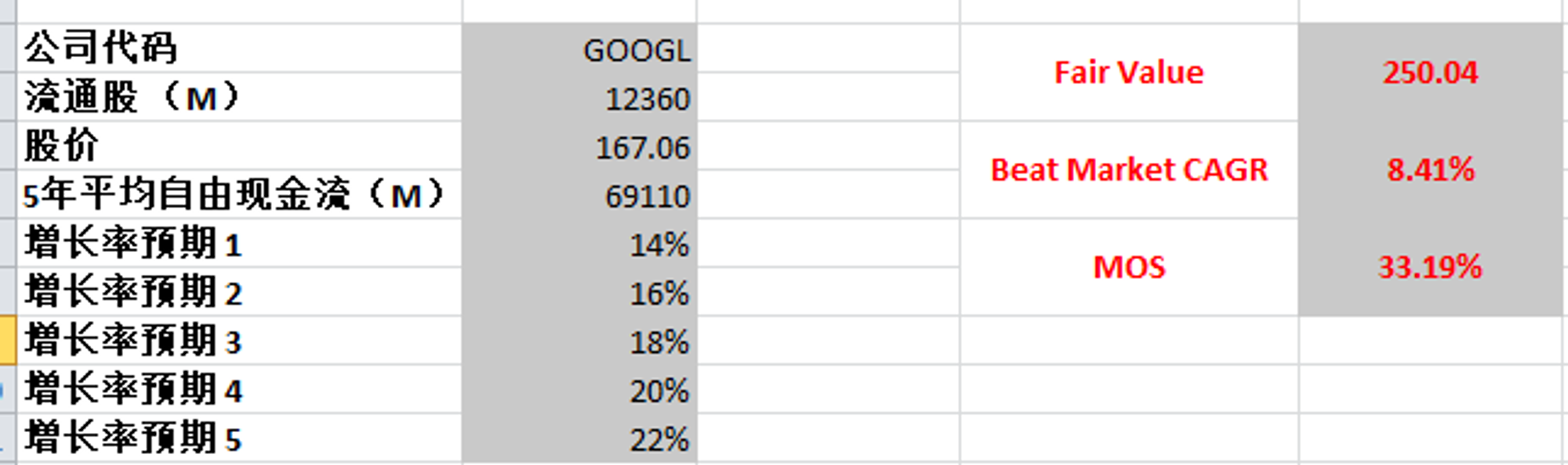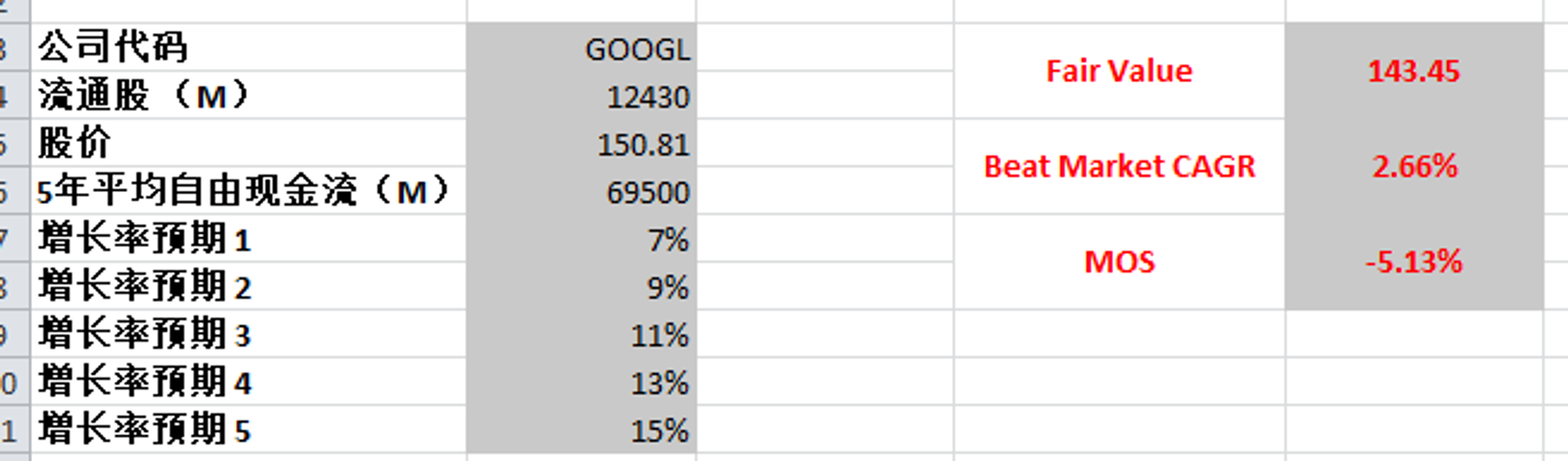 Google 最新FCF有69.5B,我最高一档使用了CAGR15%,得出合理价是143.45