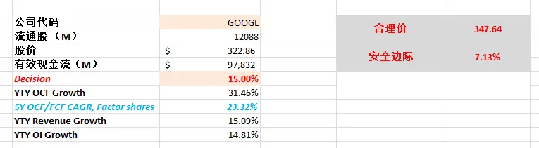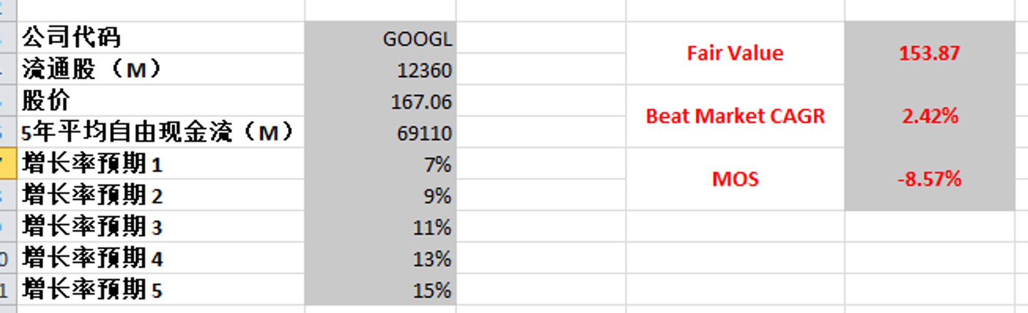 算出来合理价为153.87,这也是我一直用来给Google估值的CAGR,所以我觉得比较合理
