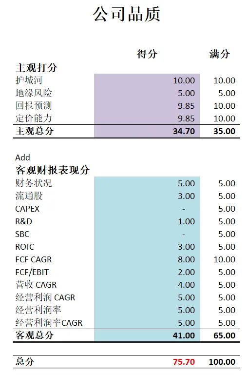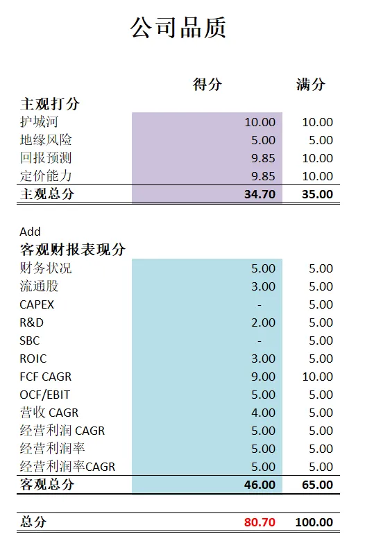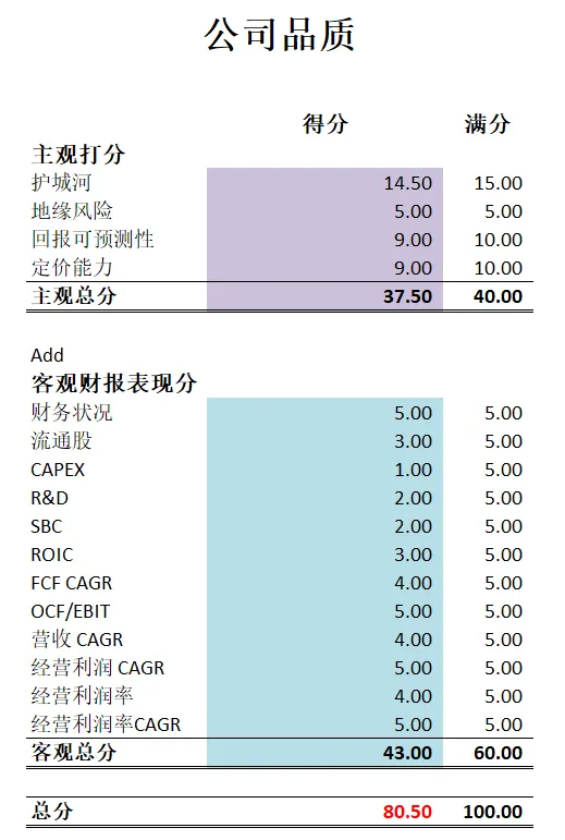 -公司品质分为80.50分。仍然是一家复利机器的打分。公司主观分我给得很高。我认为Google的护城河不但是全球第一梯队,还是最强一档的存在。所以我给了14.50分。比我给META的打分还高。