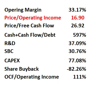 -公司短板很明显,优势也很明显,CAPEX巨大,Google目前大力开展AI和云计算方面的业务,需要大量的CAPEX。SBC派发也巨大,R&D同样巨大,这也项目基本上得不到分的同时,Google居然还有75.70分。这也说明了其他方面Google表现非常优异。