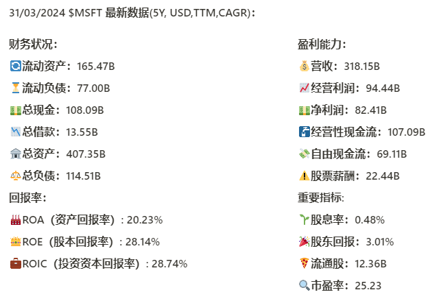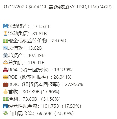Google(谷歌)表现一如既往稳定,财务健康,现金24B,相当充足,回报率稳定,盈利能力优异