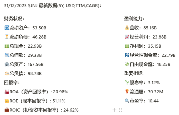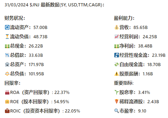 强生财务健康,现金+FCF偿还借款没有压力。ROIC常年稳定在22%左右。营收和经营利润增长缓慢,不过利润率有28.31%。FCF最新为18.70B,5年CAGR为0.37%。SBC占FCF比例为6.2%。12个月CAPEX为4.49B,占FCF比重为24%。股息率有3.41%,并且派发稳定