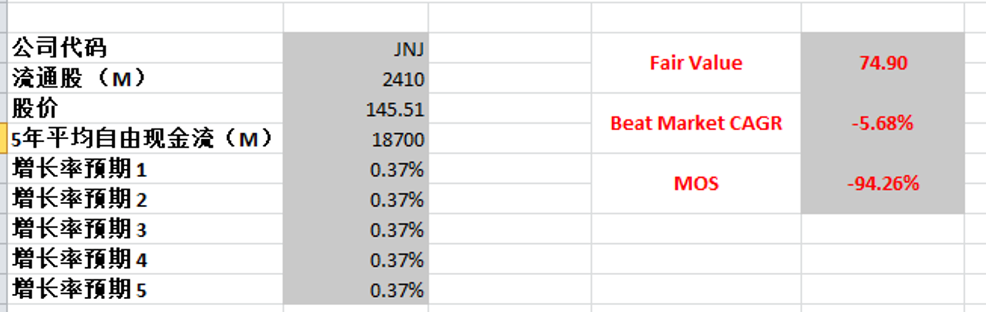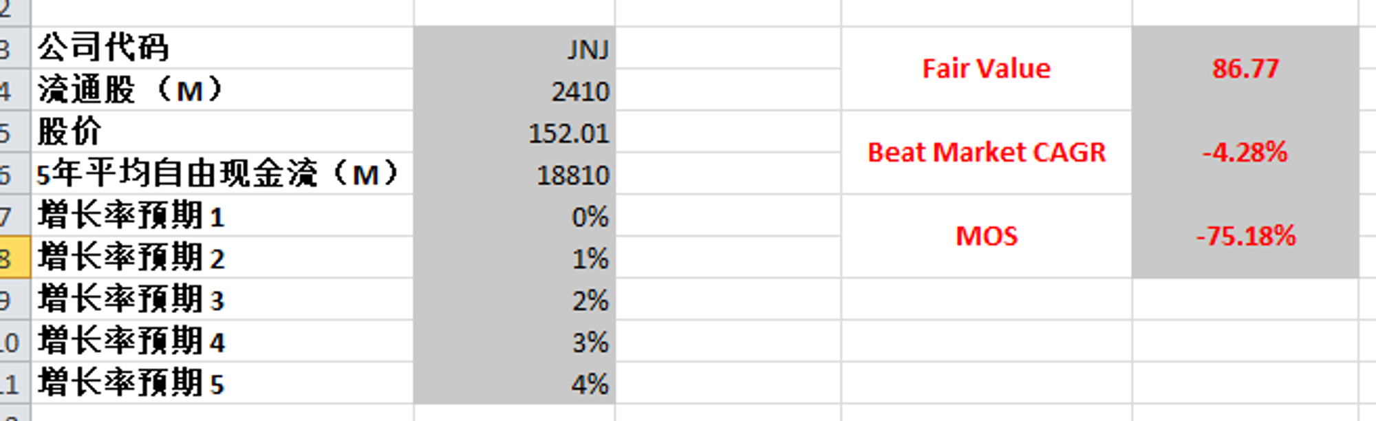 根据我的估值模型,市场给强生的定价似乎过高了,目前不存在安全边际