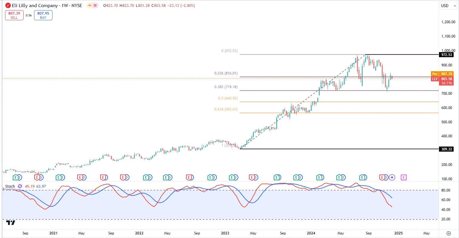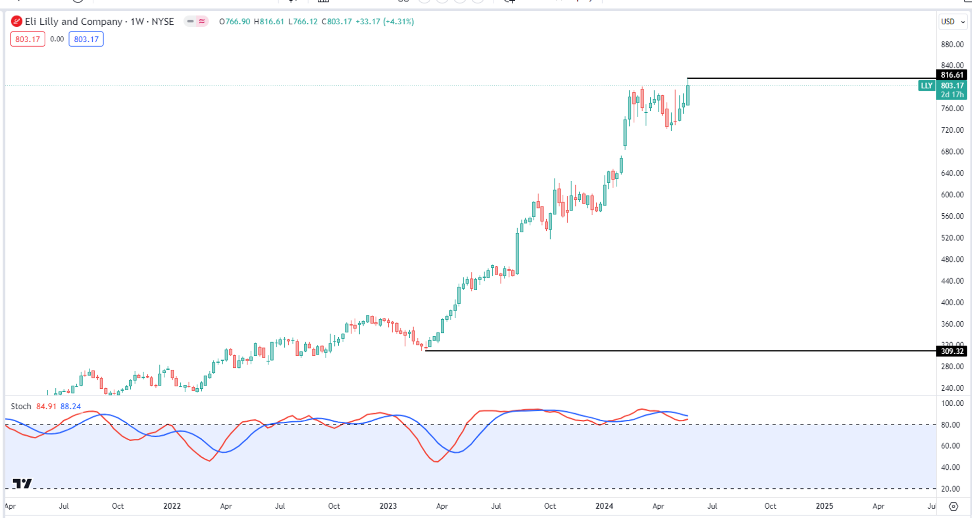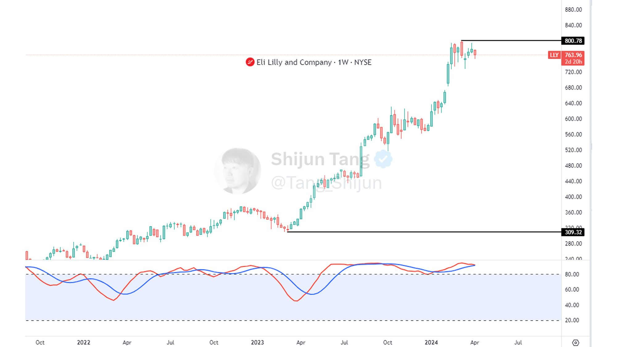 技术面来看,LLY已经在超买区域待了1年了,股价也是涨幅达到158.88%