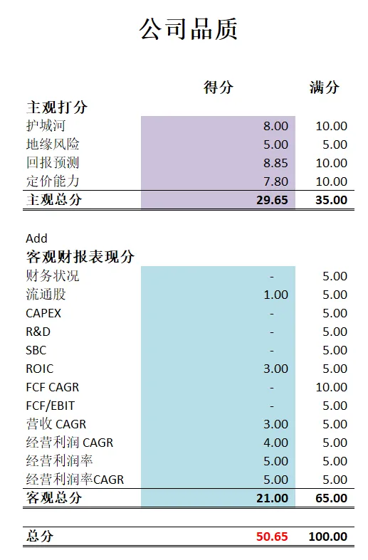 -公司品质分在我的打分体系中,只有50.65分,我看重的点基本上公司得不到分。医药业可以说是极具所有我不喜欢的点于一身产业,巨大的R&D投入,巨大的CAPEX投入,即便营收和经营利润表现再好,产生现金的能力还是很低。