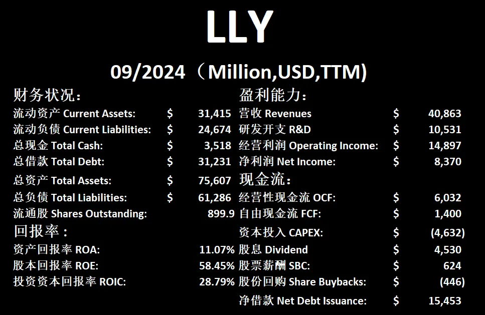 LLY的CAPEX巨大,一直研发制药,还是相当烧钱的,这也就是为什么自由现金流是-3.15B的原因