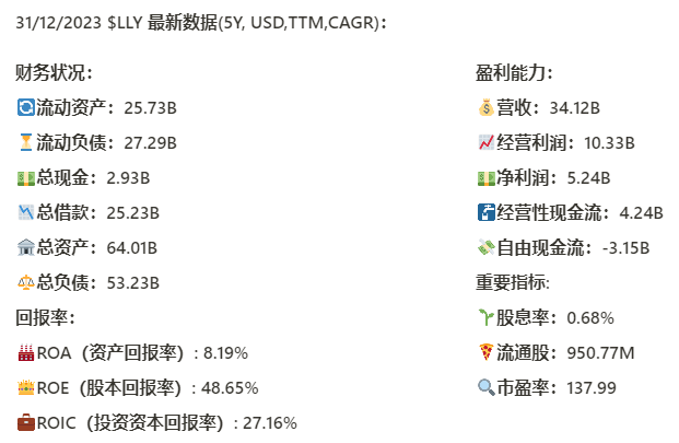 盈利能力也是创下新高,值得一提的是,LLY利润率还是很高的,我没想到医药行业这么赚钱,不过,净利比经营利润缩水一半,这里值得深挖,可能有很多原因,比如大量的借款利息支出(25.23B借款),折旧摊销也有可能是一个环节,也有可能是公司投资未实现的资本损失