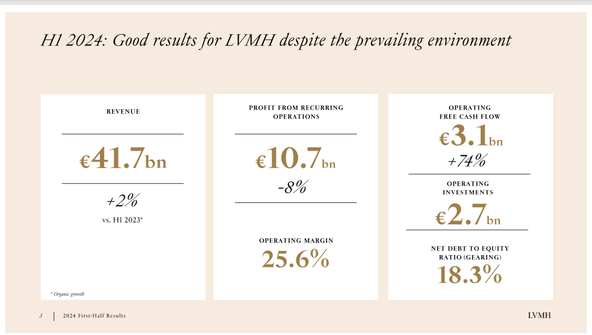 -Fashion & Leather Goods: Louis Vuitton表现强劲,尽管美国需求略有下降,营收为208亿欧元,有机增长1%,经营利润为81亿欧元,下降6%。