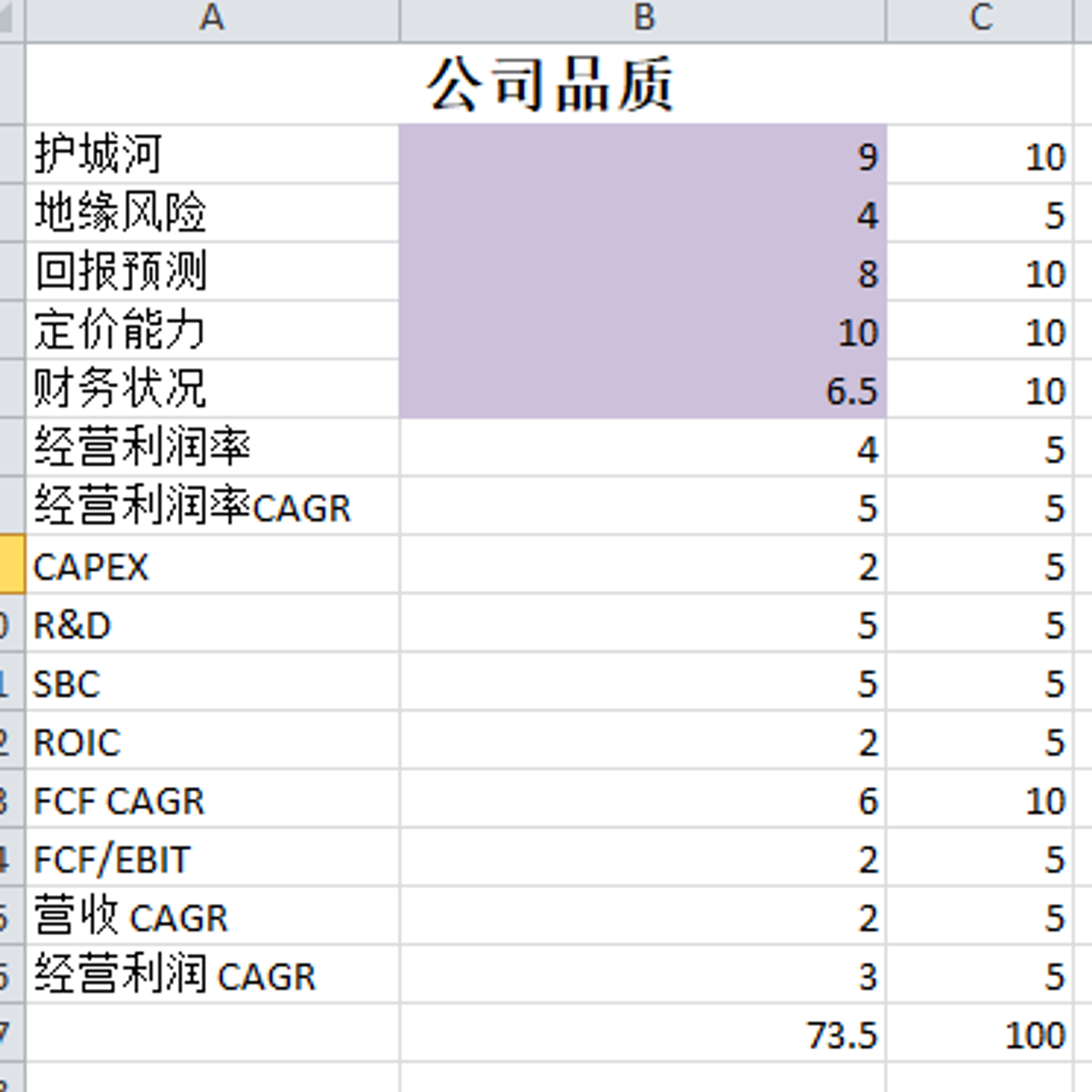 -公司品质73.5分,并没有想象中那么高,主要扣分项目是财务状况,CAPEX,ROIC,和各项盈利指标增长速度。