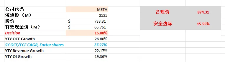 -最新财报可以说是亮眼,AI的狂潮似乎还未结束,值得一提的是,META大力回购股份,这里我认为管理层还是认为其股价是被市场低估的,因为从OCF来考虑的话,目前股价的确存在安全边际。这里我保持谨慎观点,我认为从FCF来考虑,目前市场定价合理