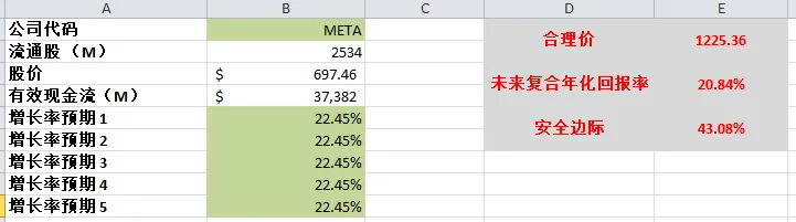 -最新有效现金流为32.64B,CAGR用15%(5年CAGR为17.29%),合理价算出来为791.18