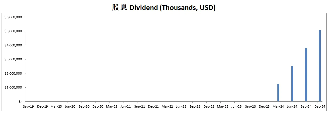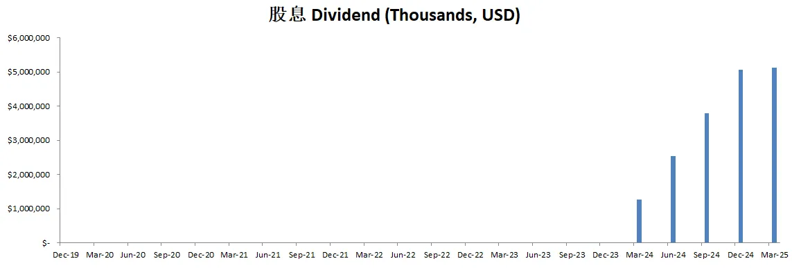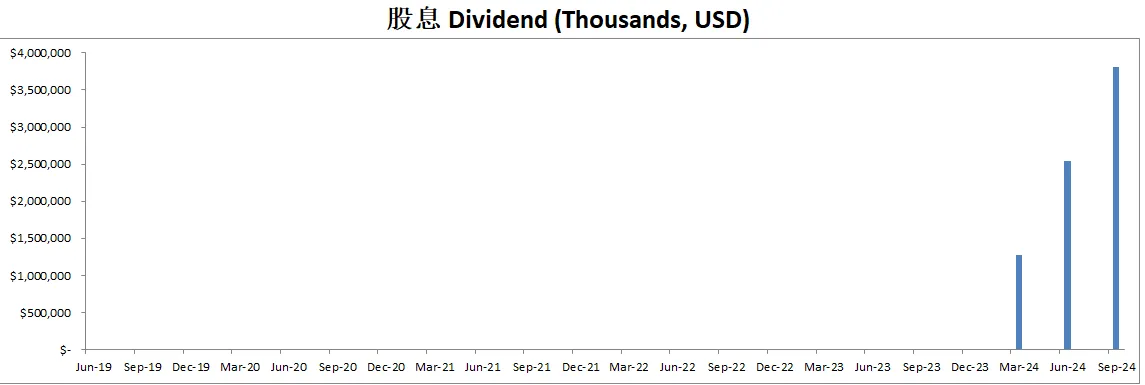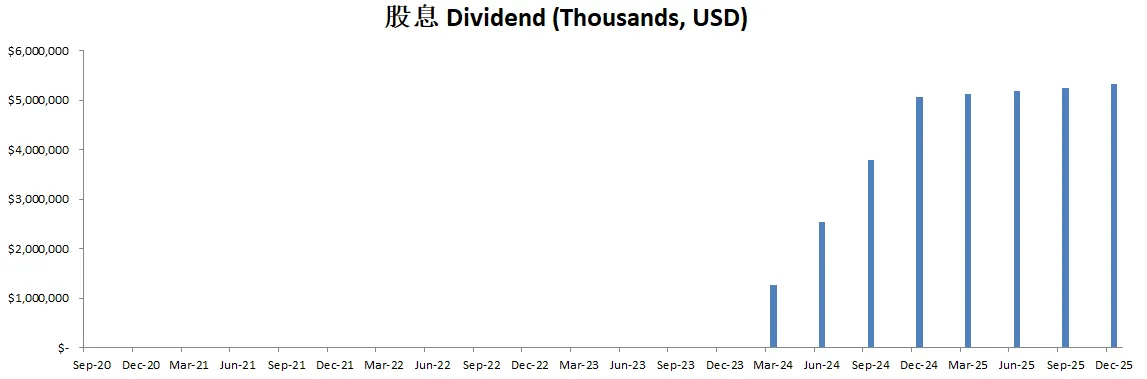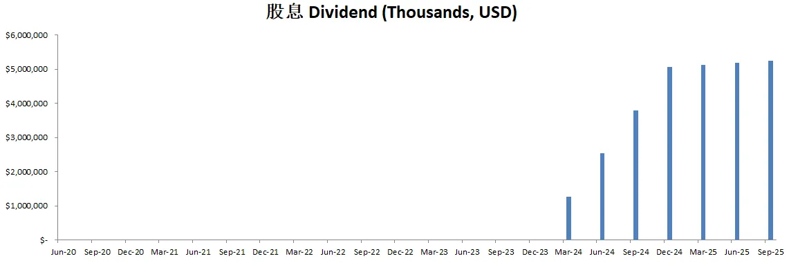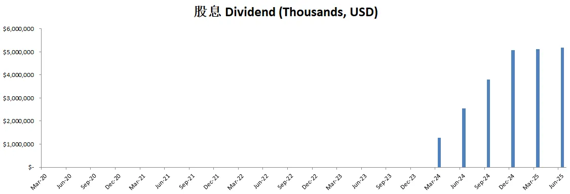 公司不但派发股息,并且最新季度回购了价值15.01B的股份,目前一年回购价值25.42B的股份