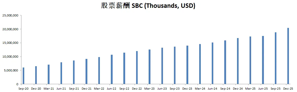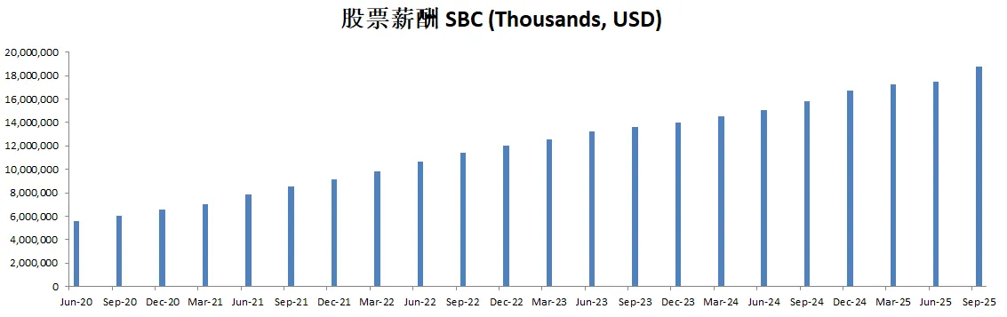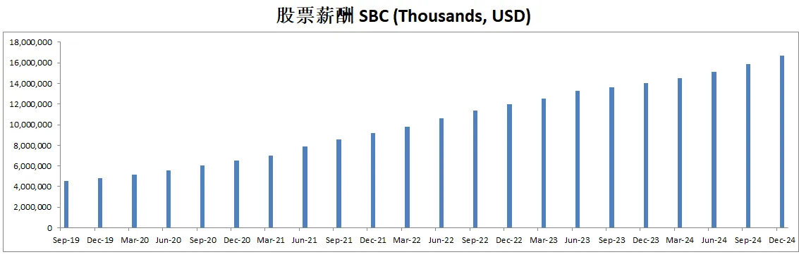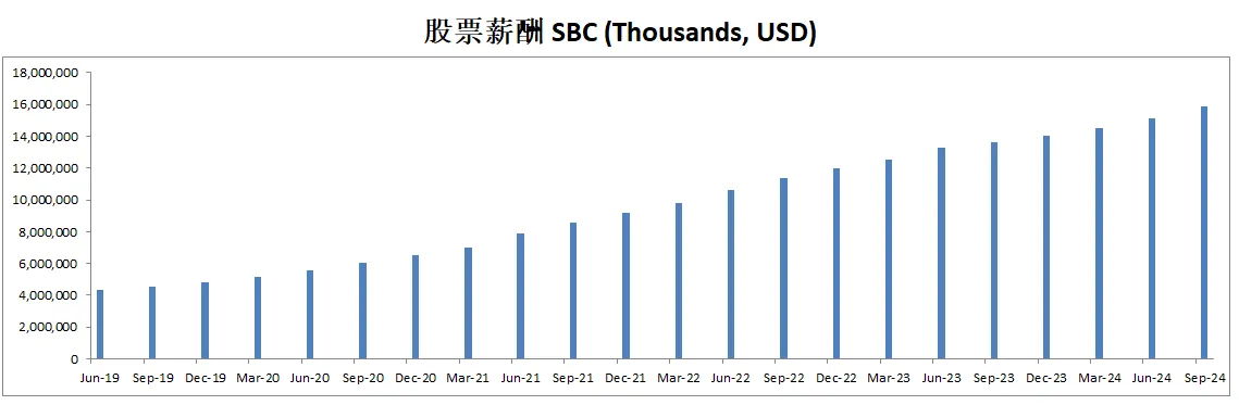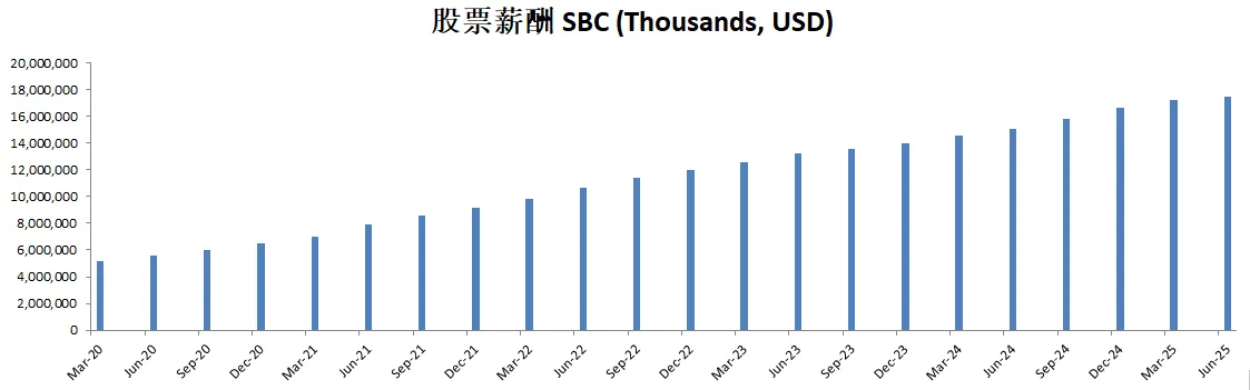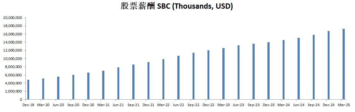股票薪酬也是水涨船高,目前来到了14.54B,5年CAGR有25.35%
