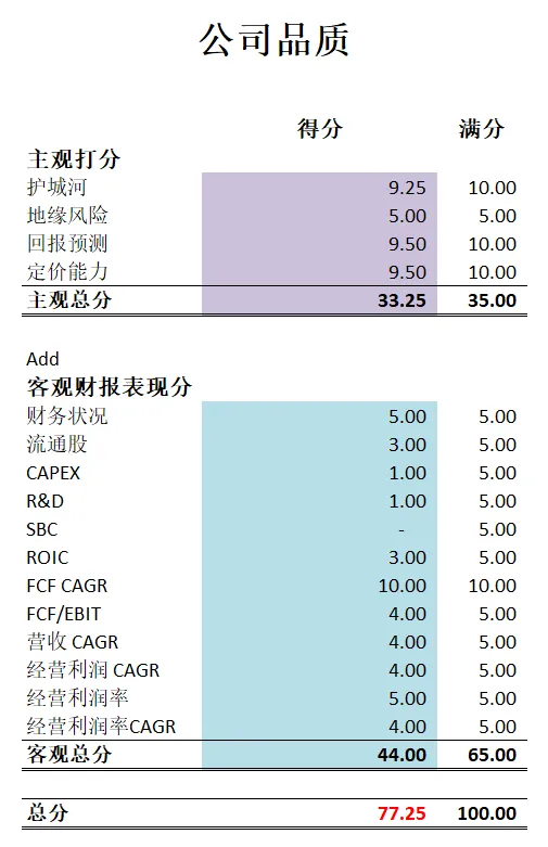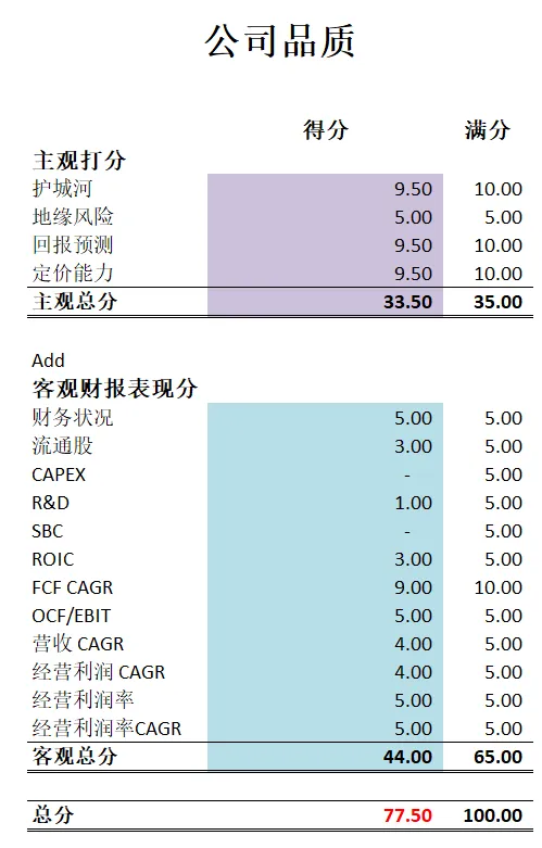 -最新财报之后,在我的打分体系中,它可以打到77.50分。分数仍然很高。因为它是3高股的原因,导致CAPEX,R&D,和SBC基本上得不到什么分。不过,除开这3点之外,其他项目上META可以说表现非常出色。很多都是满分。