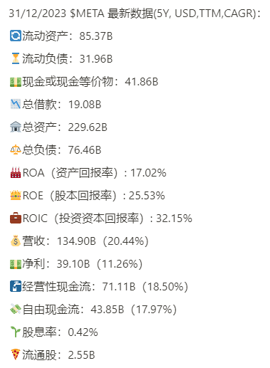 脸书 (facebook)最新面板,财务健康,现金偿还所有借款绰绰有余,回报率惊人,ROIC 32.15%,盈利能力增长迅速,破天荒开始发股息