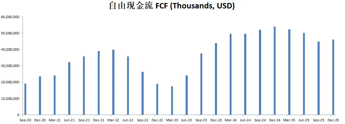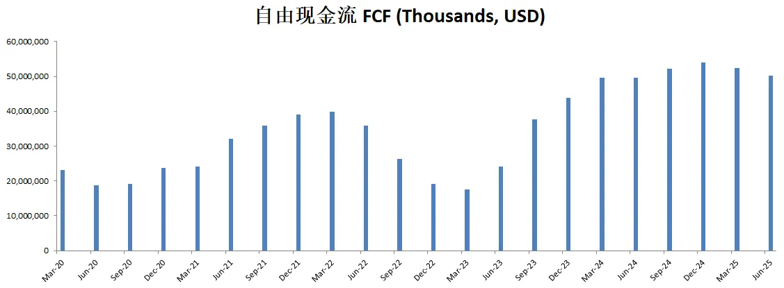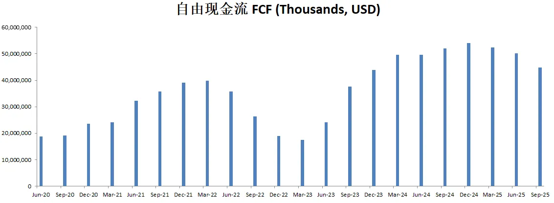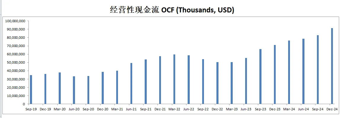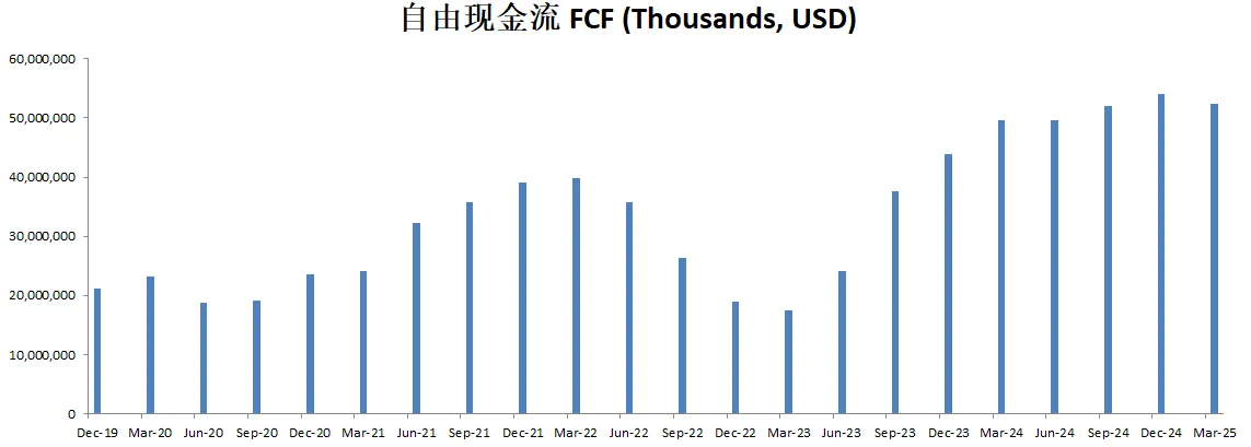 -最新FCF为49.54B,META和AMZN类似,CAPEX非常巨大,所以我在考虑未来对这种类型公司估值的时候,是否考虑OCF和CAPEX的影响