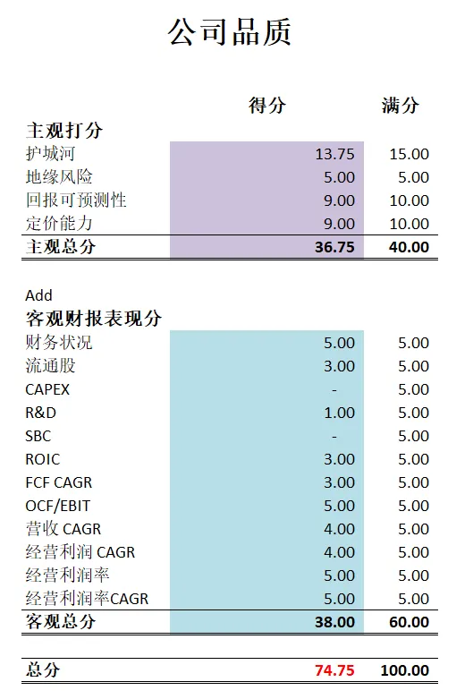 -最新财报之后,在我的打分体系下,META可以打到74.75分。主观分我给得很高,客观分除开CAPEX,R&D和SBC这三高项目上得不到分之外,其他项目上表现优异。