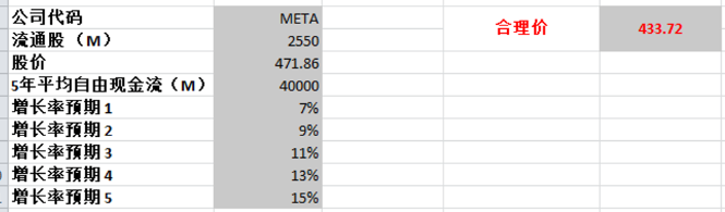 我使用了40B FCF,最高使用15% CAGR,计算出来合理价为433.72