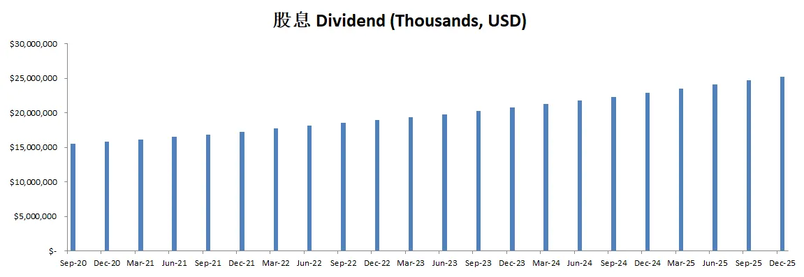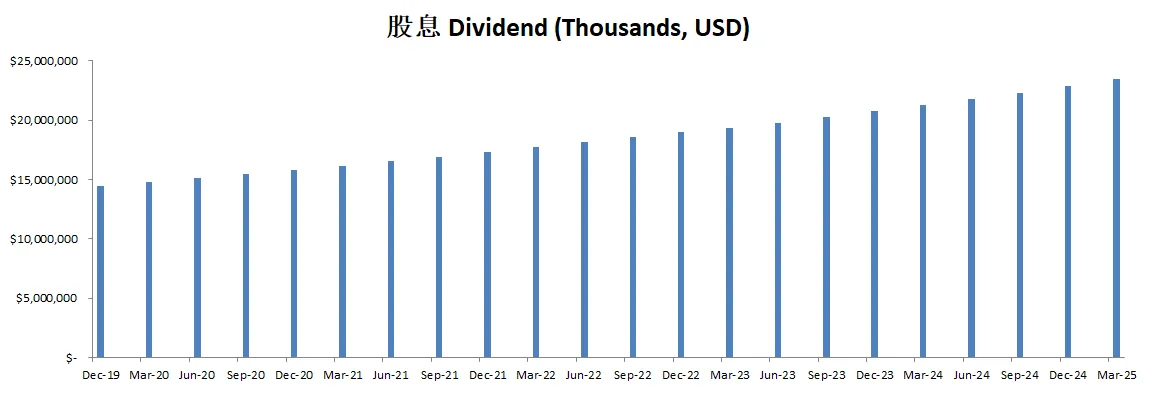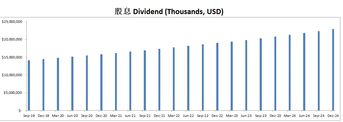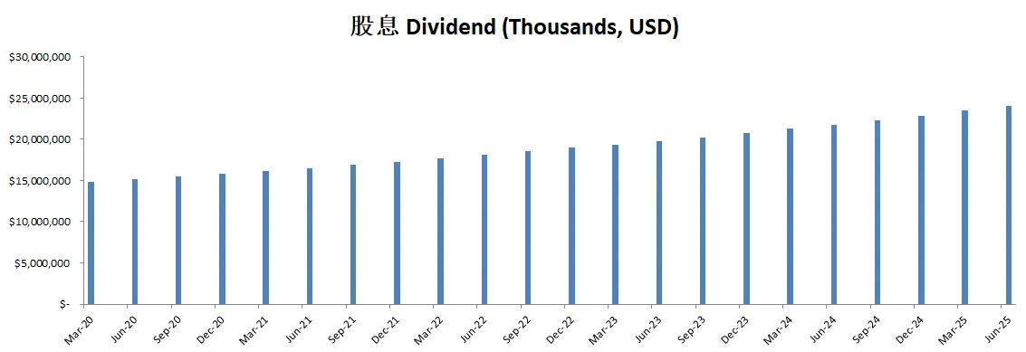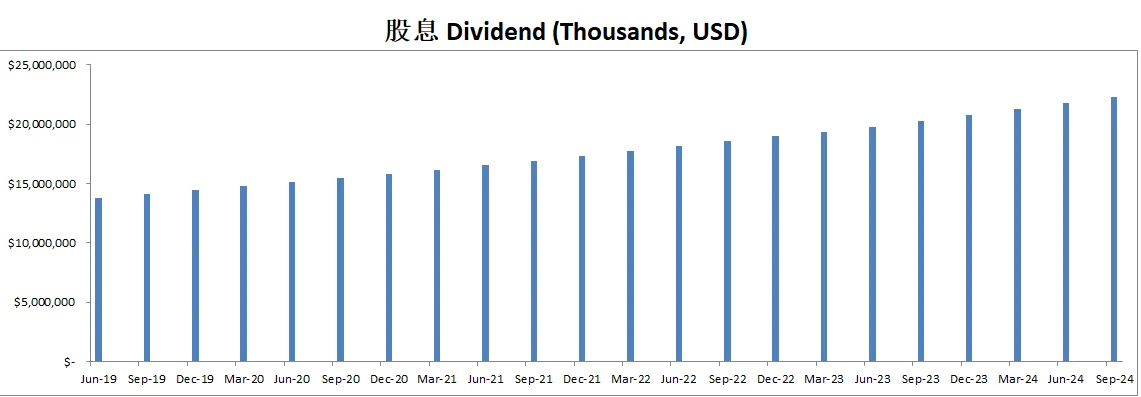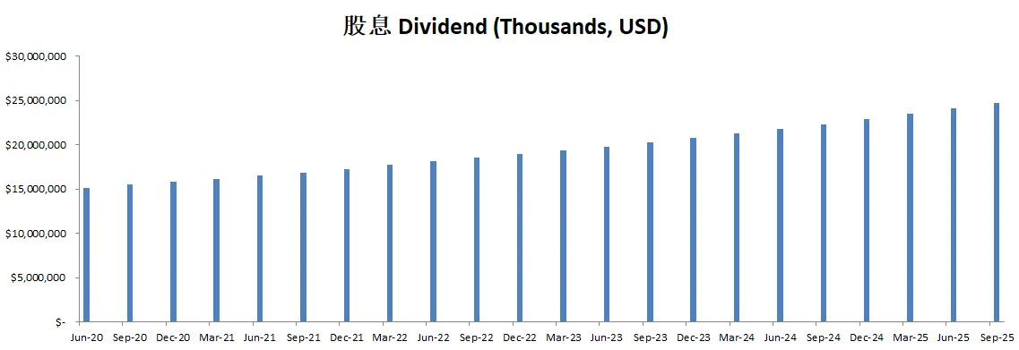 公司派发股息的同时,还进行了股份回购,最新季度回购了价值3.69B的股份,目前1年回购的股份价值16.77B