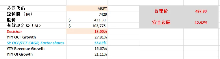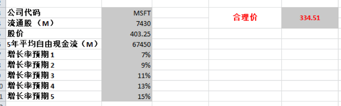 -微软最新有效现金流为94.44B,CAGR 如果用15%的话,合理价算出来为534.78。
