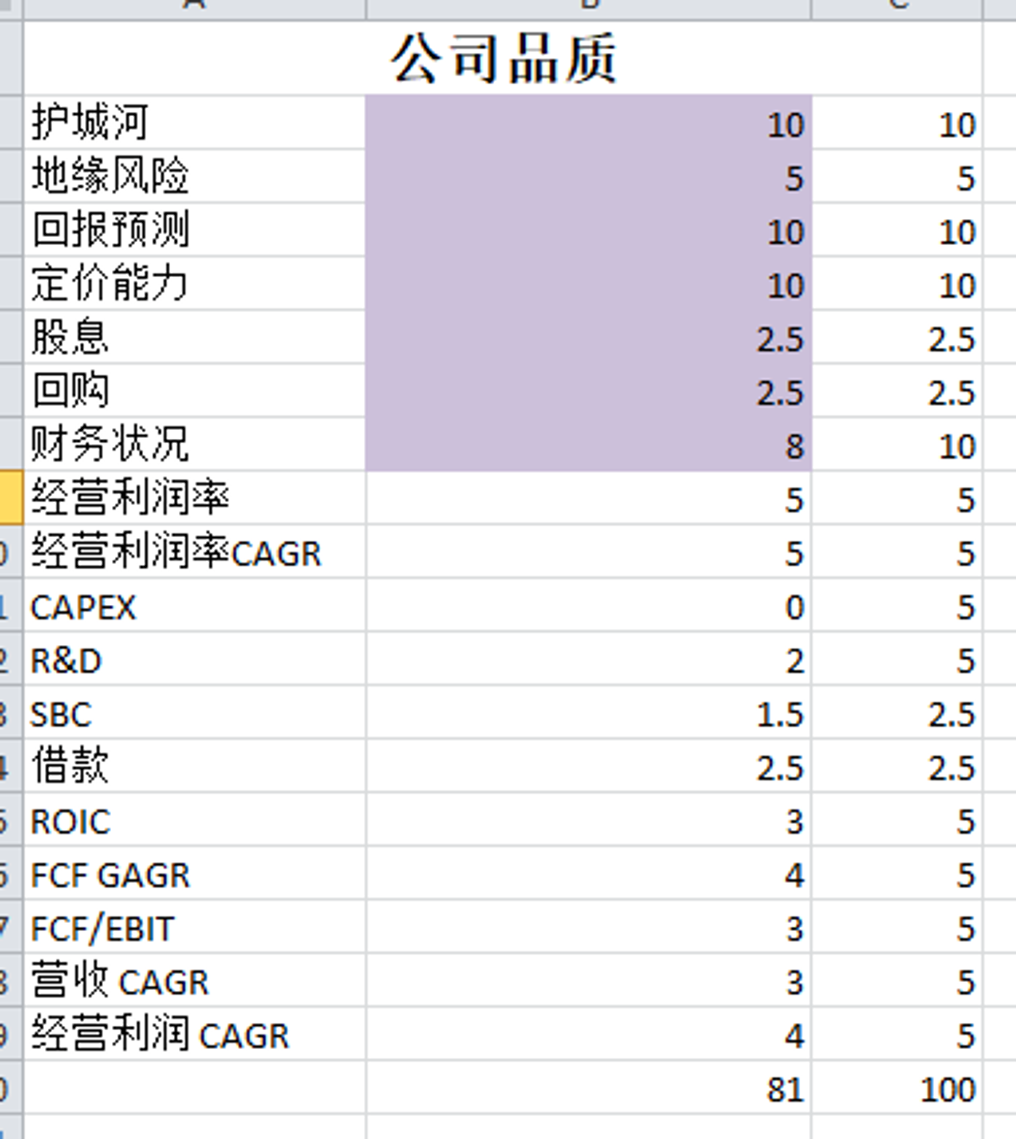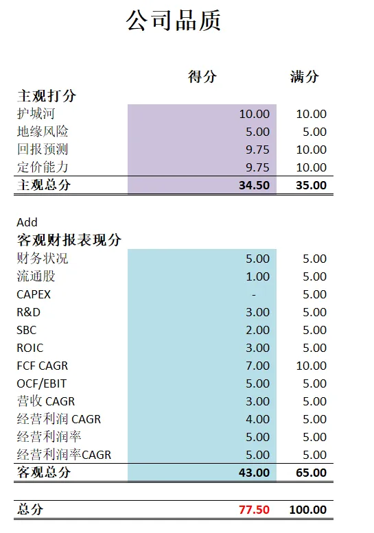 -最新财报之后,公司品质分可以打到77.5分。微软可以说是复利机器的标杆了。目前大力投资数据中心导致CAPEX得分为0。CAPEX大了自然就影响到了自由现金流,以及股份回购力度。不过,77.50分实在不低了。也没什么好挑刺地方。